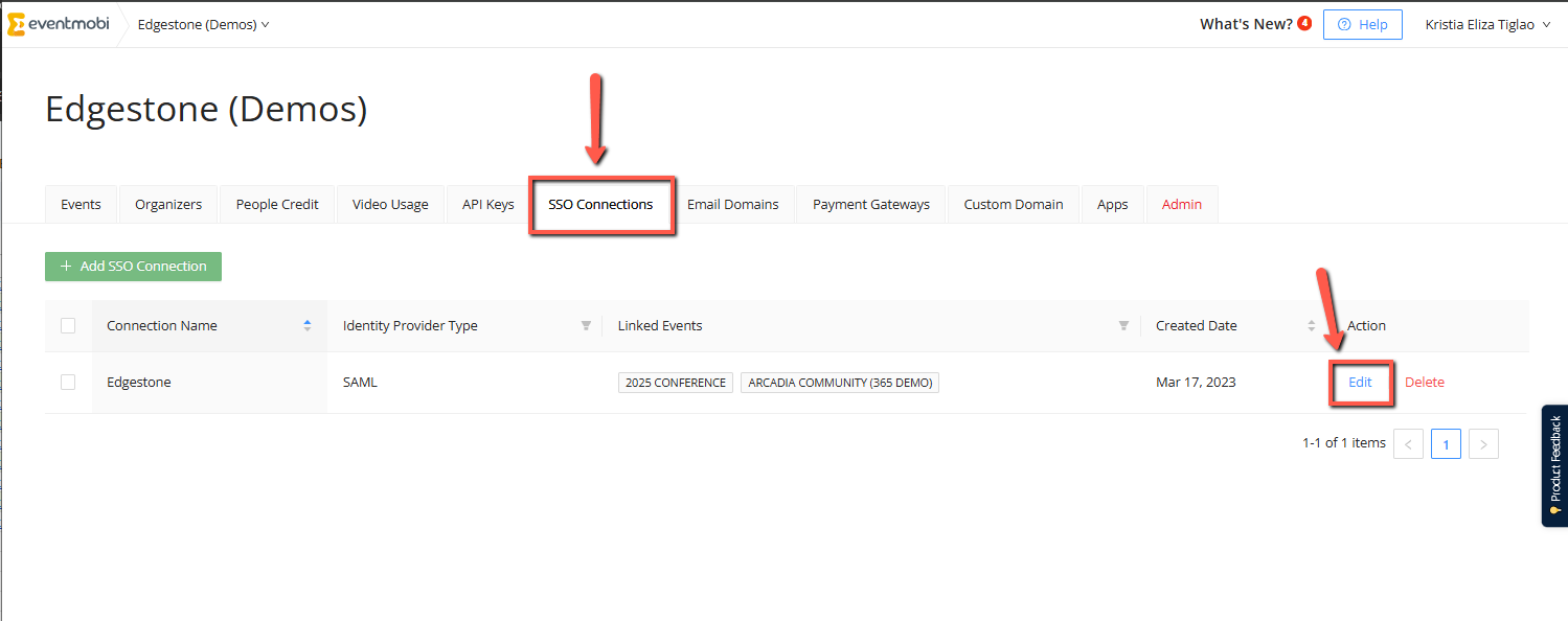 2. Find the SSO connection you want to update and click Edit on the right side of its name.