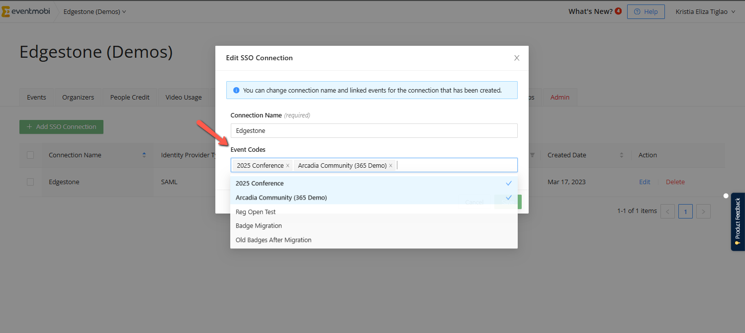 4. Click Save to apply your updates. The newly added event/s are now linked to your SSO setup, allowing users to access them seamlessly.