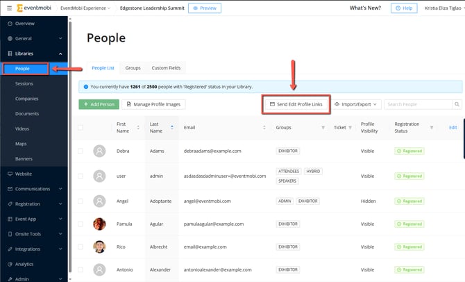 People generally like filling out their own profiles, so handing them the reigns is a great option if you don't have all the information for them (but at least their names and emails). You can do this for People profiles (Speakers and Attendees), by sending them self-edit profile links to access Attendee Portal, or Company contacts by sending email invites to company admins to access Company Portal right from the Experience Manager. These contain links that allow them to edit up their own profiles, upload pictures or logos, attach documents, and more.