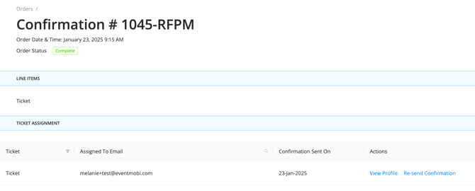 From the Orders details page, you can gain deeper insights into the registration information and navigate directly to the attendee's profile by selecting the "View Profile" option. If an attendee requests a resend of their confirmation email, this action can also be conveniently initiated from this section.