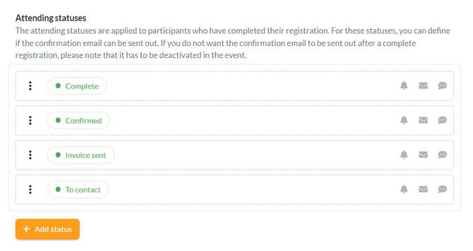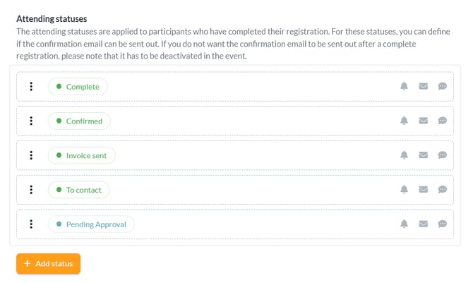 You will find three primary status types: pending, attending, and not attending. These can be individually customized in terms of naming and color coding, allowing them to align seamlessly with your event's identity and workflow.