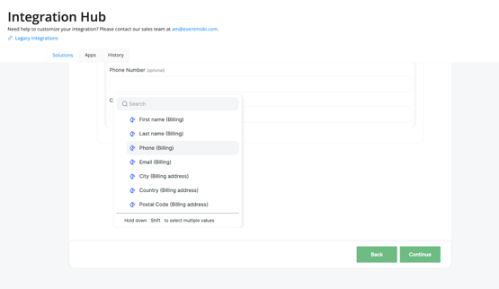To map a field, click the EventMobi field you want to use, then select the matching field from the dropdown menu on the connected platform.