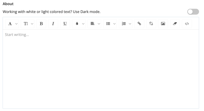 - About: Utilize the Rich Text Editor to enrich the company profile by adding detailed descriptions, company information, images, and any other relevant data.