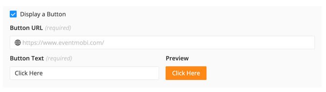 - Display A Button: To activate a Call to Action Button, simply check this box. Once enabled, you can provide the URL for an external website and specify the text that will appear on the button. A preview of the button's design will be available next to the fields. Please be aware that the button color will automatically match the link color chosen in your Event Design Studio.
