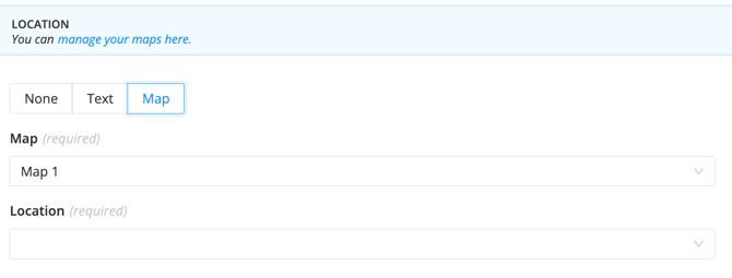 - Map: Enter the name of a Map as uploaded in your Maps library (image or Google Map). If you want to add a location using plain text only, leave this field blank and use the "Location" column instead.