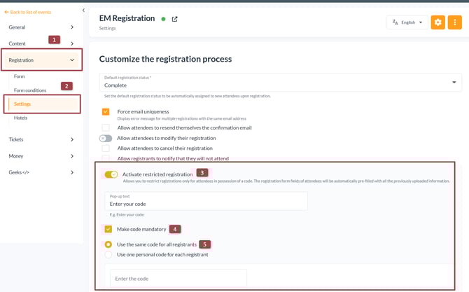To create your registration codes visit the Settings page found under the Registration area of your EventMobi Registration platform. On this page, you will find a toggle to Activate Restricted Registration. To make this code a mandatory step in the registration process, make sure to also select the checkbox to Make code mandatory.