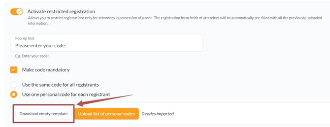 Select Use one personal code for each registrant to create a unique code for each registrant using a template that can be downloaded and imported into the platform.