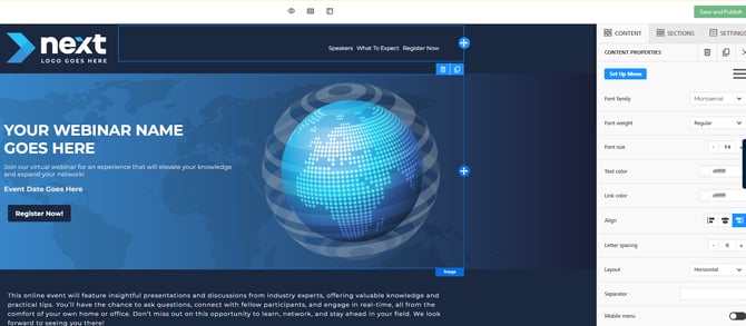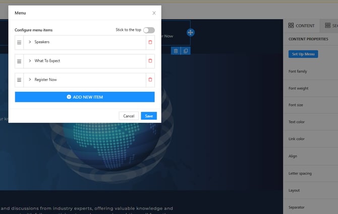 Headers and footers can be synced across your website to make it easy for viewers to navigate between pages. This maintains consistent navigation and branding across your entire event website. A sticky header menu is a navigation bar that remains visible at the top of your browser window as visitors scroll down your page.