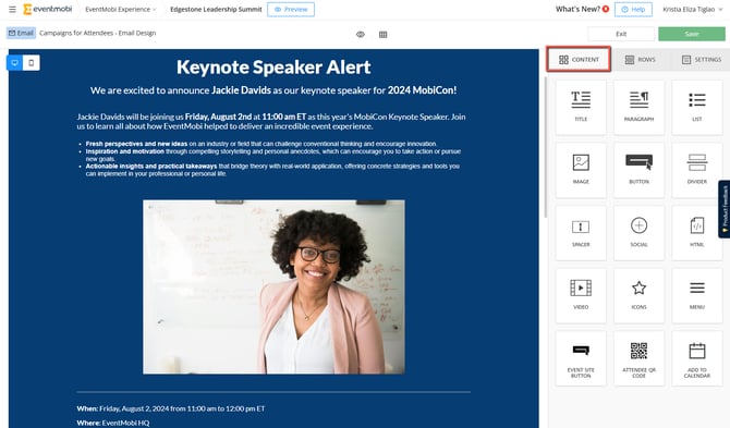 - Use the Content tab to include various content types into your email body, including text, media and calls to action.
