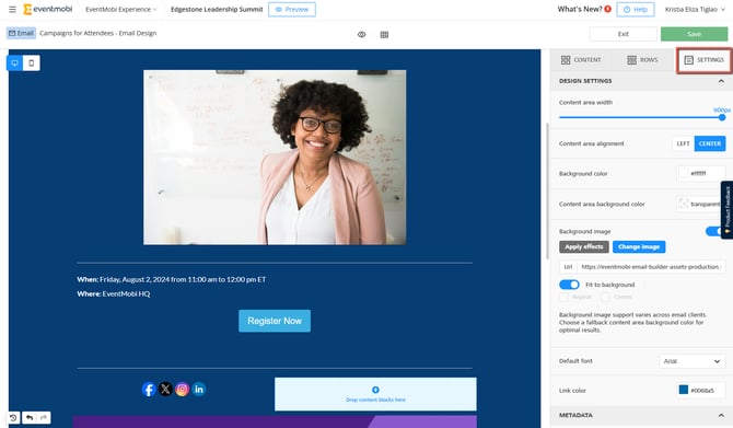 - Use the Settings tab to update the general settings for your campaign, or for specific content types (when they are selected in the content builder).