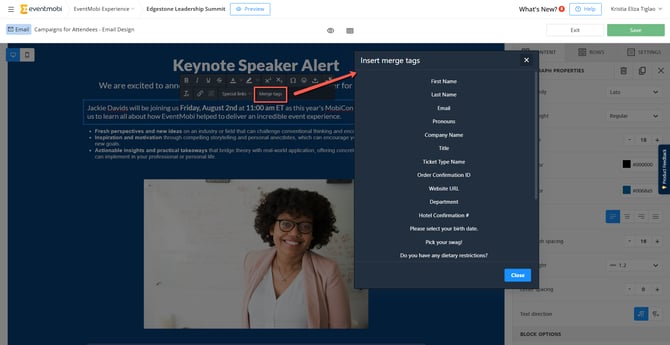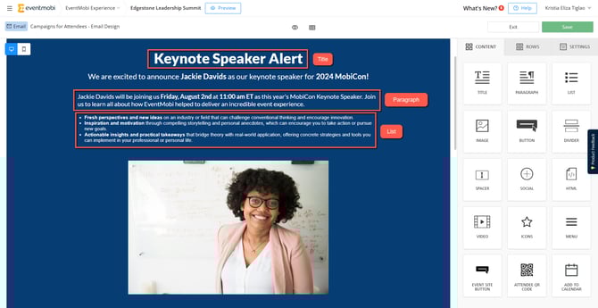 Note: Title and Paragraph fields will offer a rich text menu where you can customize the content you are adding even further. From this area, you will find a Merge Tags option that can be used to personalize the email message by adding data contained in the person's profile fields. Additionally, this will not appear as the actual upon doing a Send Test Email in email campaigns.