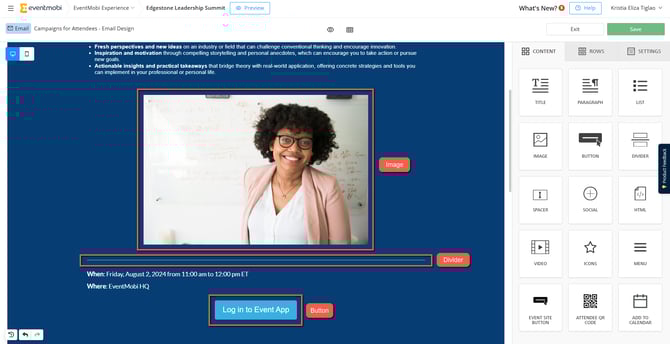- Button: Use this to create a button that will direct attendees to a URL, send an email, prompt a call or a text message.