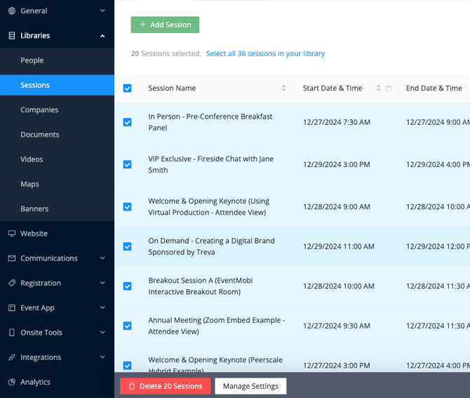 If you want to update capacity or conflict settings across multiple sessions simultaneously, use the bulk management tool in your Sessions list.
