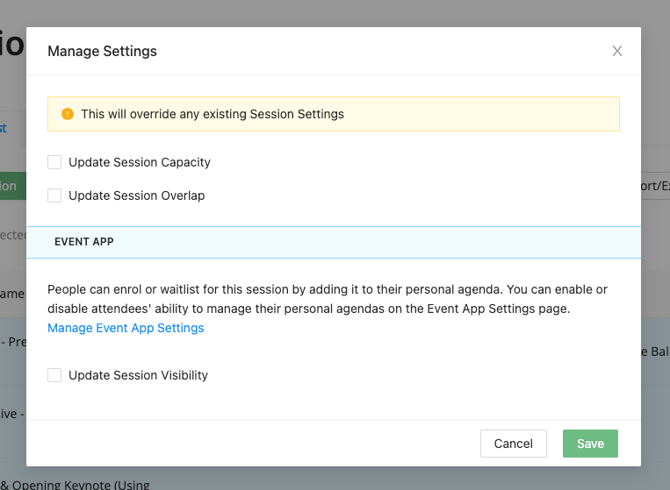 - Update Session Overlap – Apply Conflict Management settings to all selected sessions.