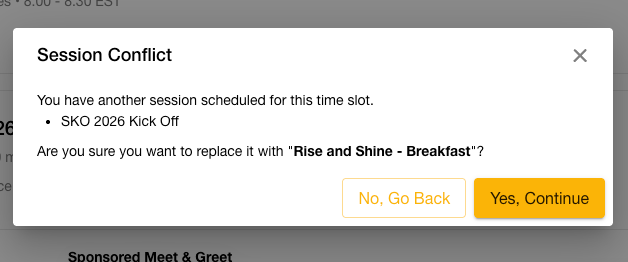 - Attempt to add overlapping sessions (for example, “Rise & Shine Breakfast” and “Sales Kickoff” both at 8:00 AM).